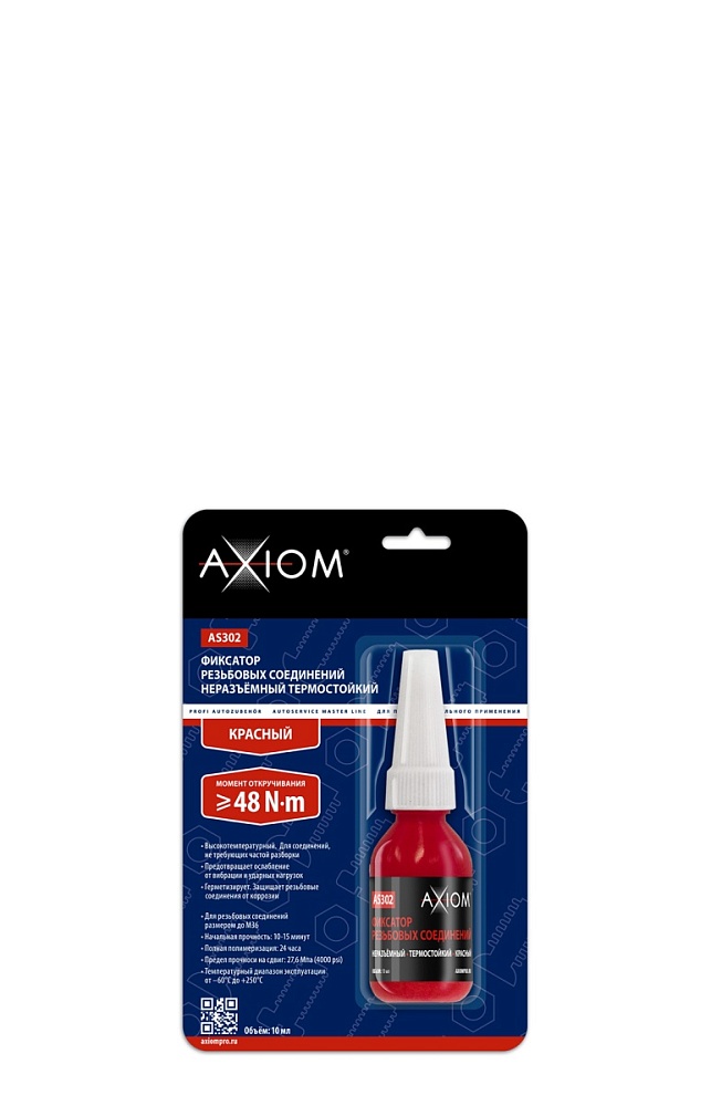Высокотемпературный однокомпонентный анаэробный состав предназначен для фиксации и герметизации не требующих частой разборки резьбовых соединений, подверженных вибрации, ударным нагрузкам и воздействию высоких температур. Препятствует ослаблению и саморазвинчиванию крепежных соединений. Устойчив к воздействию автомобильных технических жидкостей (масла, тормозной жидкости, антифриза, бензина, дизельного топлива и др.).Предотвращает коррозию резьбы. Фиксатор резьбы AXIOM® AS302 полимеризуется без доступа воздуха в зазорах до 0,25 мм. Температурный диапазон эксплуатации отвержденного фиксатора от ‑60°C до +250°C. Момент откручивания на незатянутой резьбовой паре не менее 48 Н·м. Предел прочности на сдвиг – 27,6 МПа (4000 psi). Предназначен для крепежных элементов размером до М36. Статья в блоге →